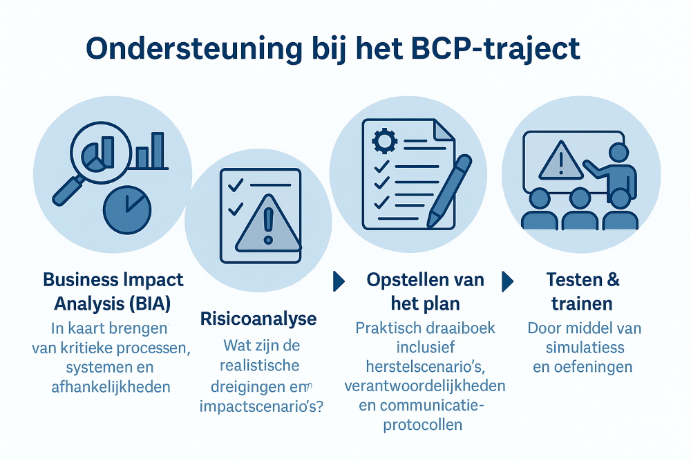 Business Impact Analysis (BIA): in kaart brengen van kritieke processen, systemen en afhankelijkheden.